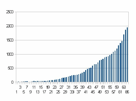 今日の日本の感染者数ですが、昨日より87名増えて1953名。1/27からの感染者数の推移グラフは以下の通り。