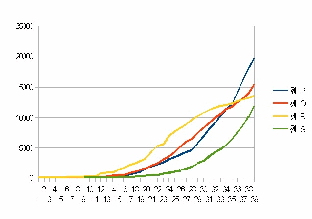 急拡大が始まったなと感じるのがブラジルとロシア。同じぐらいの感染者数のブラジル(青)、ポルトガル(赤)、オーストリア(黄)、ロシア(緑)の感染者数のグラフは以下の通り。