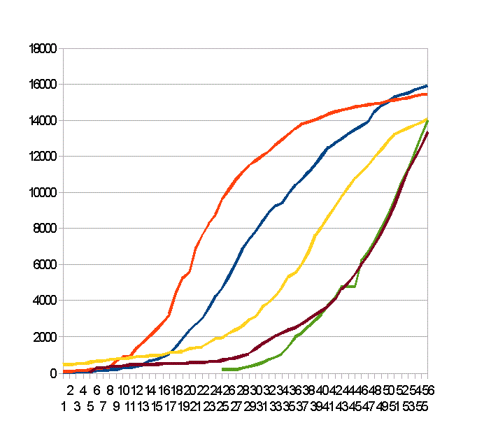 グラフは今日現在日本と同程度の感染者数のイスラエル(青)、オーストリア(赤)、日本(黄)、ベラルーシ(緑)、カタール(茶)のグラフです。