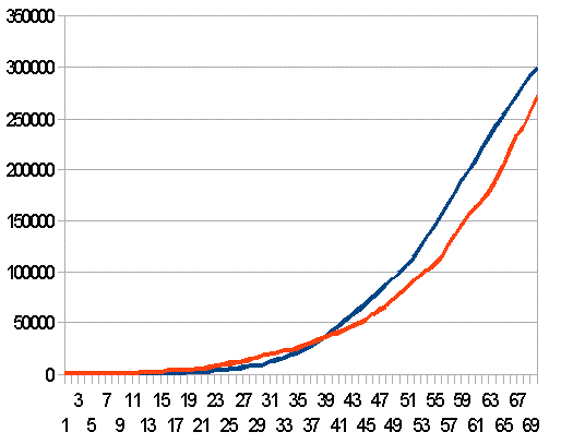 ちなみに現在アメリカ以外で急拡大をしているのがロシアとブラジル。3/12からの感染者数の推移は以下の通り。青がロシア、赤がブラジルですが、両者ともに明日か明後日には30万名を越えそうです。