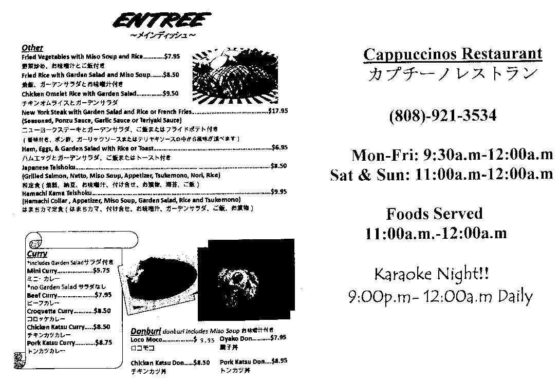 結構夜遅くまでやっています。上のメニューを見ると、日本の定食屋さんのようなお品書きです。下のカレーは日本人の味付けです。ミニカレーといってもハワイですから、そこそこの量があります。