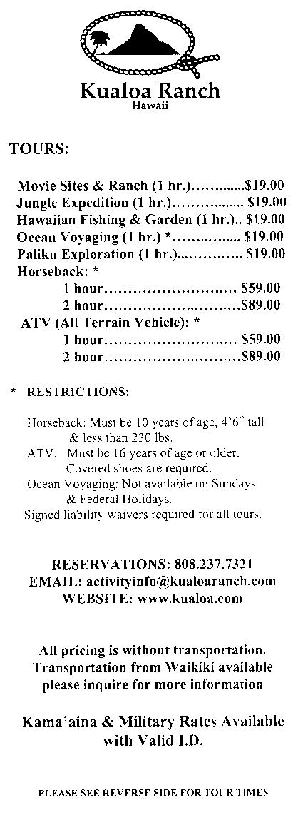 ワイキキから送迎付きのツアーで参加すると、料金はかなり高額になりますが、レンタカーで現地まで行けば乗馬を除いて19ドルです。