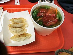 私はその隣の店の「Mr EGG ROLL」という所で、チャーシュー麺+餃子セット 約6.2ドル、息子はさらにその奥のパン屋さんでチョコレートパン 2.1ドルを買いそれぞれ食べた。
